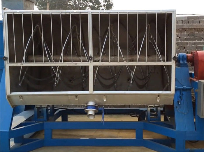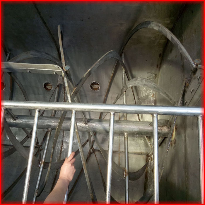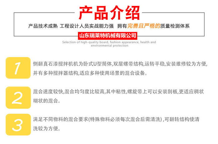 該設(shè)備為臥式U型結(jié)構(gòu),筒體采用碳鋼和不銹鋼(201/301) 材質(zhì),內(nèi)外兩層螺帶交鍇布置,混合逮度快,均勻度高;軸承及攪拌葉片采用碳鋼/不銹鋼錳鋼鑄造材料,槳葉拋光,結(jié)實(shí)好用;設(shè)備的90度翻轉(zhuǎn)結(jié)構(gòu),操作時(shí)可將殘余物料卸出,清洗工作更方便,降低了勞動(dòng)強(qiáng)度,提升了生產(chǎn)效率:各部位密封技術(shù)好,放料口采用防水蝶閥密封,減少了生產(chǎn)過程中的漏料滴水問題。整套生產(chǎn)線由真石漆攪拌機(jī)、控制柜、螺旋提升機(jī)(20噸以上設(shè)備建議采用斗式提升機(jī))組成,可根據(jù)客戶需要,配置合理機(jī)型,批次產(chǎn)量最多可達(dá)到40T。